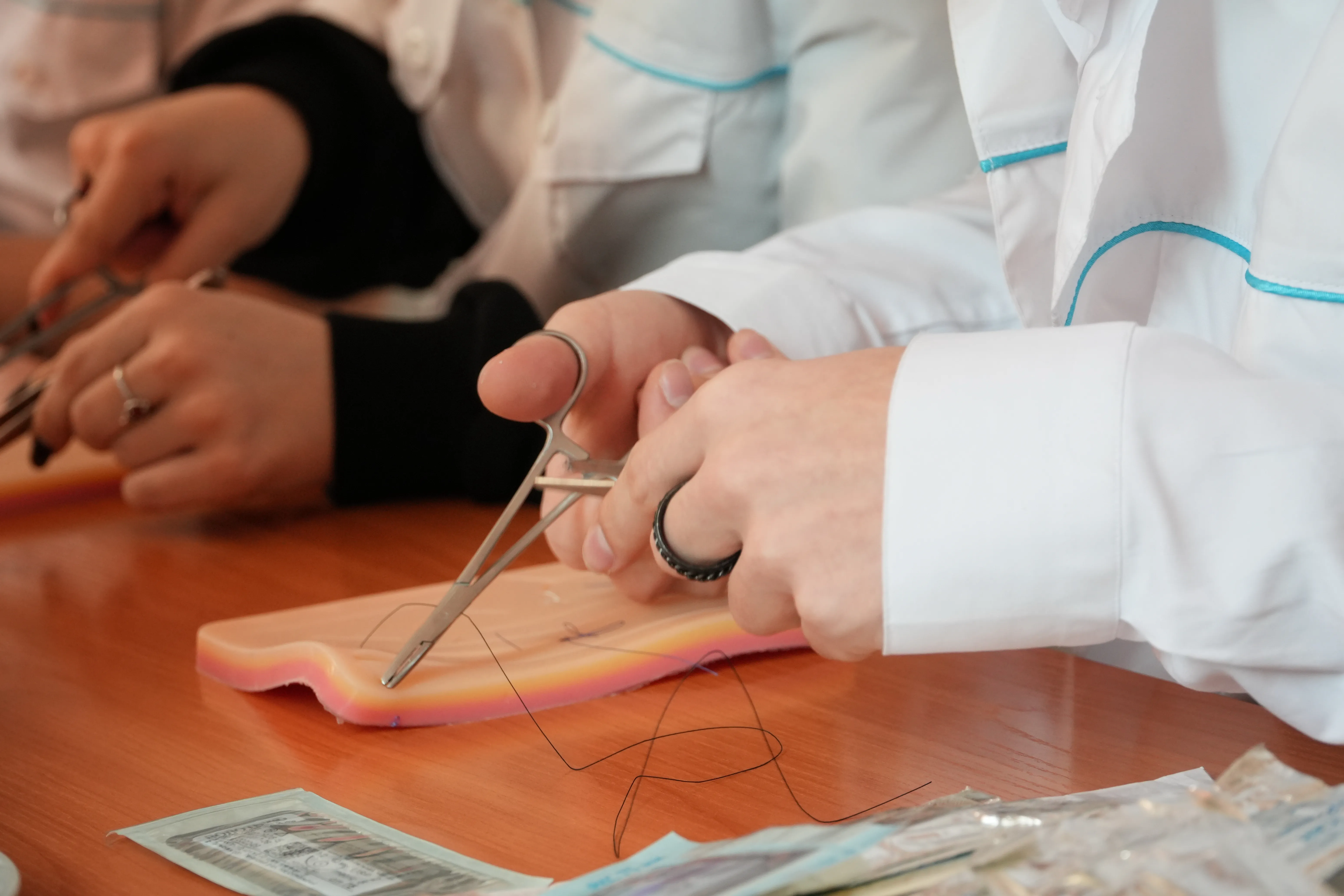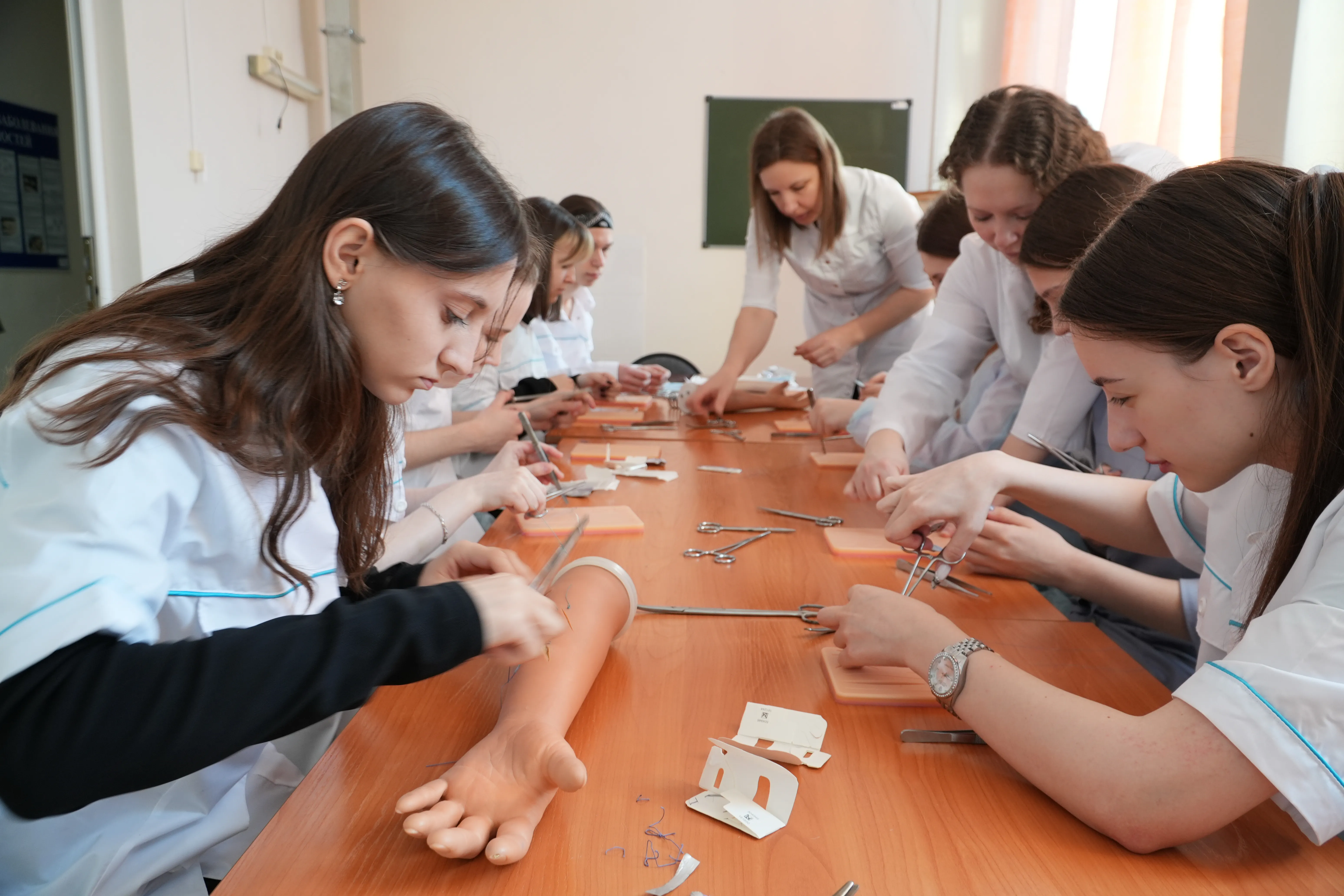 In the therapeutic building of the city clinical hospital at the Department of Surgery with a course of urology, another group of high school students under the guidance of assistants of the department, Natalia Anatolyevna Dupliy and Ekaterina Pavlovna Ivanova, immersed themselves in practice. High school students trained in suturing and knitting surgical knots on skin simulators learned to handle a needle holder and tweezers.
